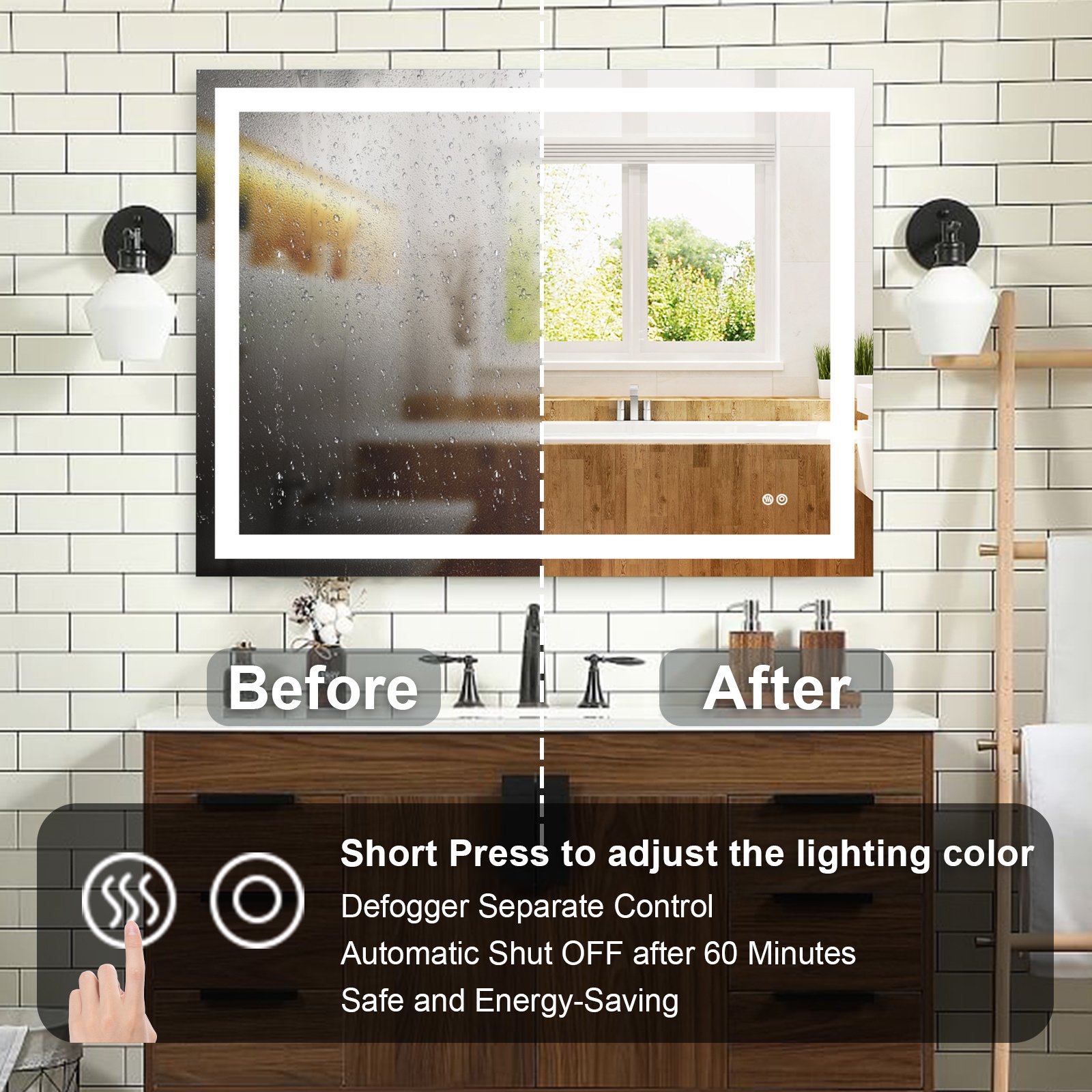 The bathroom mirror with LED light; Made of high qualit Anodized aluminum can be used for long time. High tech Intelligent bathroom vanity makeup mirror with defogging function. Touch sensor button can adjustable mirror color brightness from 2700K-6300K to meet the needs of different light. Brightness can be adjusted freely from 10 % to 100%. Large size bathroom mirrors wall mounted design; it is space-saving. Bright mirror can make your bathroom or living room can be more spacious; Better mood. Perfect for bathroom; bedroom; dressroom; powder room and more.