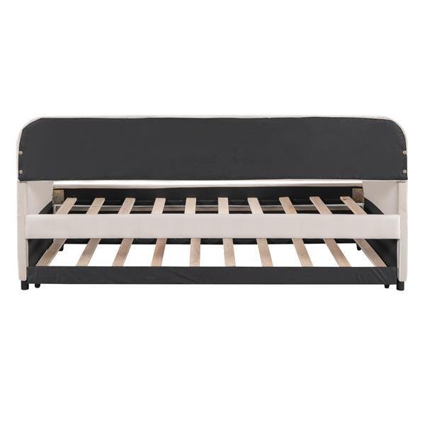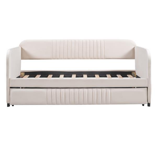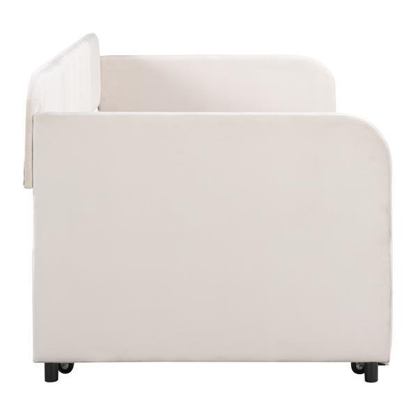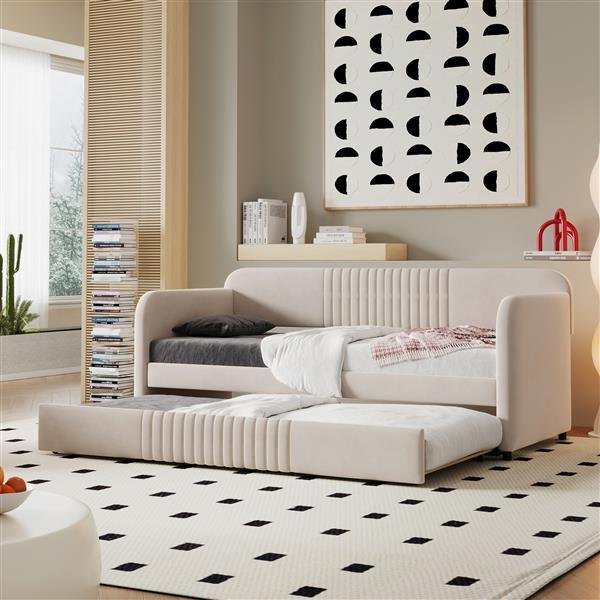 Upholstered Daybed Sofa Bed Twin Size With Trundle Bed and Wood SlatIf you need extra sleeping space or your kids love sleepovers, this daybed with trundle bed is perfect for your home. High-quality,a strong, durable frame ensures stability and durability for long-term use. Slat kit included so box springs are not required. This daybed is designed with a clean silhouette and a hue of elegance. It suits all styles of home decoration, and completes the look of any bedroom.Weight & DimensionsOverall Product Dimension79.3"L x 40.94"W x 37"HDetail Product DimensionPlease refer to the Size imageNumber of Package2Package DimensionPlease refer to the SpecificationOverall Product Weight99.55LBSPackage WeightPlease refer to the SpecificationWeight CapacityBed:250LBS Trundle:250LBSNumber of SlatsBed: 10 Trundle:10Recommended Mattress Thickness8"SpecificationsProduct TypeDaybedSizeTwinColorBlue/Beige/GrayProduct materialVelvet+WoodSuggested Number of People2Country of OriginVietnamNotesManual measurement has been used,there may be some reasonable error. All the pictures are taken by actual samples, slight chromatic aberration may occur due to lighting or display.[Elegant design] Elegant style Upholstered in carefully-selected velvet fabric, this daybed not only suits any home decoration, but is timeless in its design. The soft textile bedhead creates coziness, while the single color of the design creates versatility.[Solid & Sturdy] The daybed frame is made of high-quality plywood, providing a dense and strong support. The construction ensures both a lifetime of use, and a sturdy frame with a backrest which won't wobble.[Space-saving] This twin daybed comes with a twin size trundle, easy to pull in and out, multi-functional piece of furniture ideal for small living spaces.The daybed and trundle will each support a twin-size mattress.[No Box Spring needed] This daybed frame comes with sturdy wooden slats. Mattress is not included. A comfy velvet fabric backrest and two armrests that bring you and your family a cozy feeling.[Dimensions] Overall Product Dimension:79.3'' x 4 .94'' x 37''(L x W x H). Mattress not included. Some assembly is required, although we have provided clear instructions and tools.